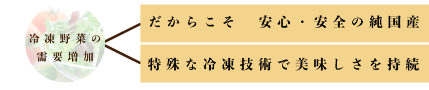 日本の農業が抱える高齢化問題、後継者不足の現状が深刻になる中、大小かかわらず加工工場に出荷することにより収穫した収穫した野菜野菜すべてを利用でき、農家に手間をかけずに農家に貢献、価格も規格品と規格外品の中間のため安く仕入れることが可能。 農家がいままで廃棄していた野菜の販売を実現し、農家の収益を向上させた上で、消費者に安心・安全の国産野菜の冷凍品をお安くお届けすることが可能となりました。